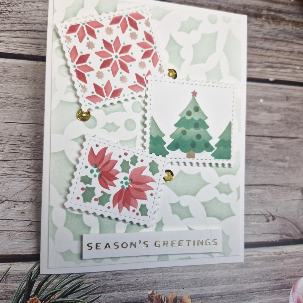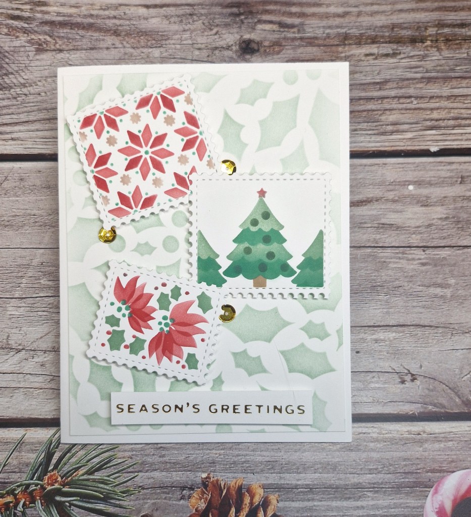 I had already ink blended and cut apart the images, so I created the muted holly background using a recently purchased holly stencil from Clarity Crafts, and cut it down slightly smaller than an A2 card base.