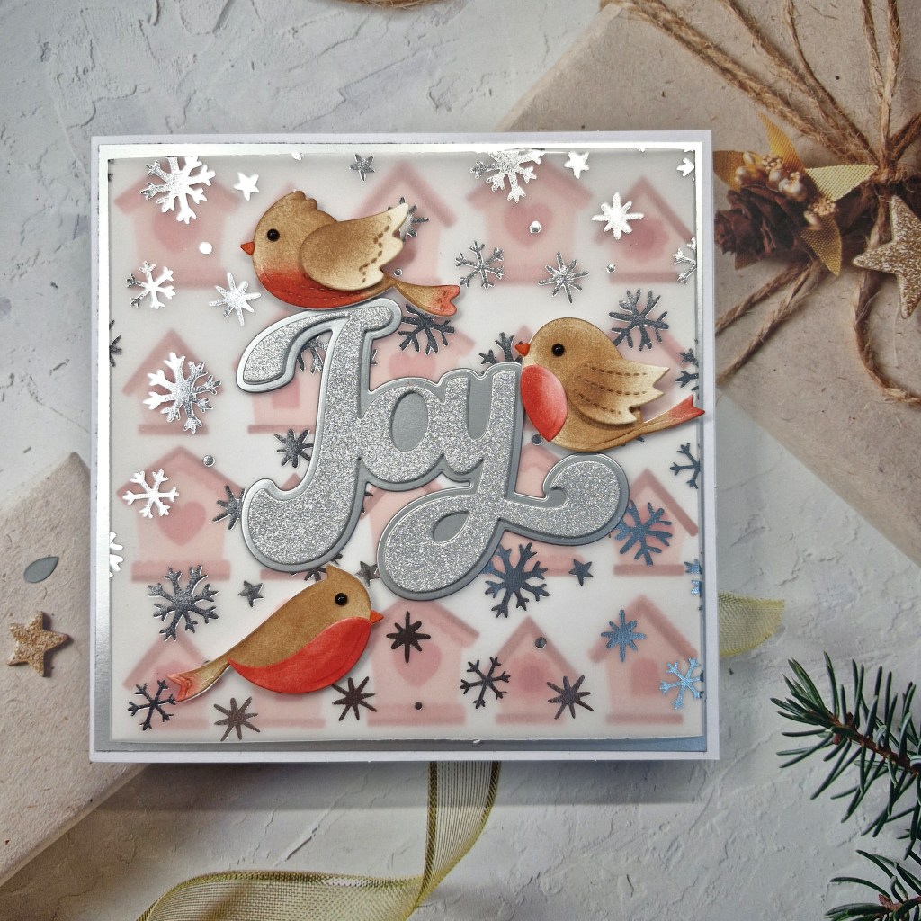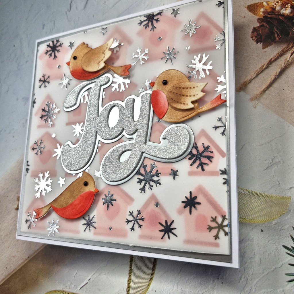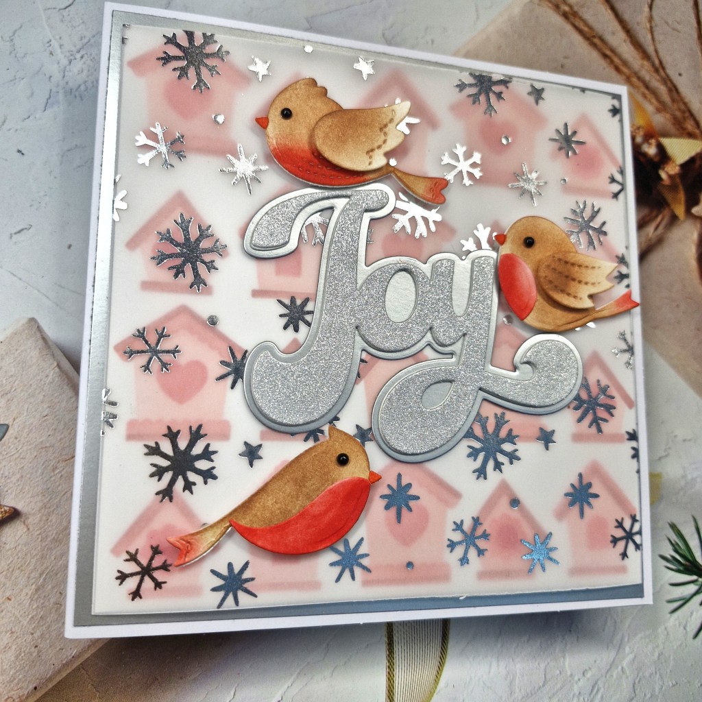After placing the birdies on the background panel – they didn’t really stand out very much so I looked for a way of still showing the background stencilling and found this Polkadoodles vellum with silver snowflakes….