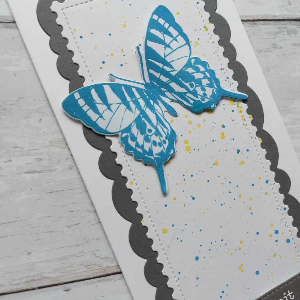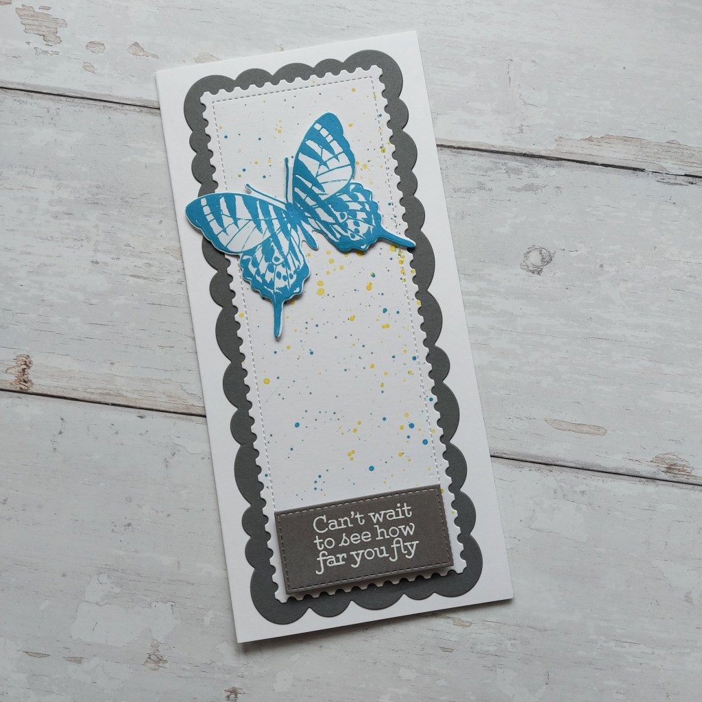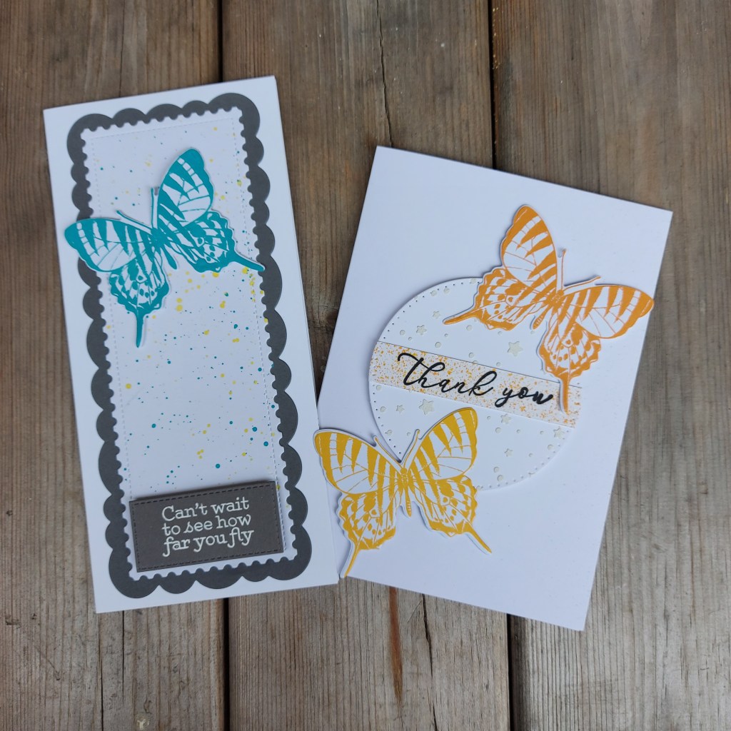 The card on the left is my version of the slim line card. I stamped the butterfly in Distress Oxide ‘Peacock Feathers’ for a solid impression. I was going to colour the white parts in – but decided it looked good as it was.