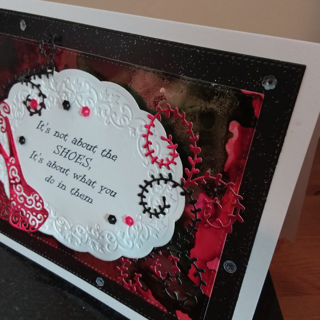 I began by die-cutting the Tattered Lace ‘Platform Shoes‘ in shiny red card. These are the kind of shoes I loved to wear – very high, huge platform, and lacy. Unfortunately – age and bunions and knees and hips etc have made wearing these kinds of shoes quite uncomfortable – but I still keep them just in case!