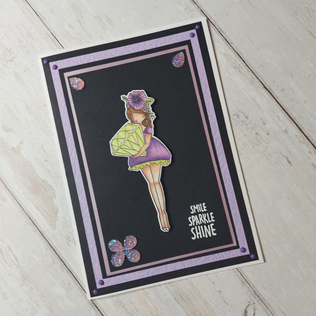 This curvy girl is from Stamping Bella, stamped with Gina K amalgam ink then coloured with Copics.
