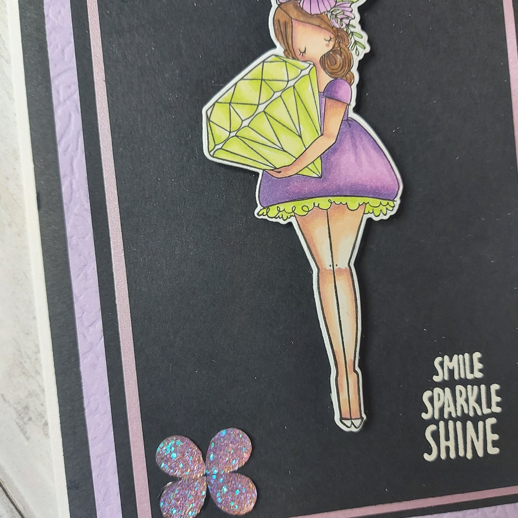 I thought it needed a little more bling/jewels, so I used some blingy purple tear-drop thingies……….no clue where I got them from but the colour seemed to match to dress…….and also found some Nuvo drops that matched too, but I restrained myself with those and only added eight drops….. :)